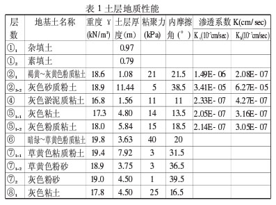 D区换乘段的基坑工程以及围护结构设计方案的参数:换乘段基坑开挖深度约24.07 m,D区换乘段南北地下连续墙为1 000 mm厚,深度为40 m,入土比约为0.667;东西两侧临时封堵墙厚度为800 mm厚,深度为34 m。 根据岩土勘察报告土层有关技术参数,工程地质条件如表1。