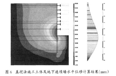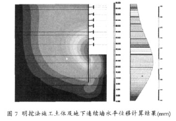 3.2.2 明挖法施工模拟 如考虑下三层采用明挖法施工,共需设置7道φ609×16 mm钢管支撑,通过有限元模拟计算其土体及地下连续墙体的水平位移情况明显大于盖挖法施工模拟计算的结果,且对周边土体的影响范围亦有显著增大(图7)。