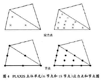 (3)开挖至第六道支撑底面标高,并安装第6道φ609×16 mm钢管支撑。 (4)开挖至第七道支撑底面标高,并将第6道φ609×16 mm钢管对直撑移位至第七道支撑位置。 (5)开挖至基坑底面设计标高,并依次完成换乘段底板侧墙以及地下一层、二层部分未完成的结构施工。3 有限单元法模拟分析 本文拟采用荷兰岩土分析软件PLAXIS程序中的二维分析软件包对本工程施工过程按照工况进行模拟,并分析了模拟计算与实际结果的比较情况、盖挖施工与明挖法施工的比较情况。为了模拟最深开挖工况情况,将模拟断面选取在B轴或G轴线处。3.1 PLAXIS模型建立与参数选取3.1.1 土体本构模型 土体采用摩尔-库仑(Mohr-Coulomb)模型,在PLAXIS程序当中Mohr-Coulomb模型,共需要5个参数杨氏模量E、泊桑比ν、内摩擦角φ、内聚力c、剪胀角ψ。在真实土体中,刚度在很大程度上依赖于应力水平,即刚度通常随着深度的增加而增加,PLAXIS引入高级参数Eincrement用来反映刚度随着深度的增加而增加的,它表示杨氏模量在每个单位深度上的增加量(单位:应力/单位深度)。Eactual=Eref+(yref-y)Eincement(y<yref) 内摩擦角在很大程度上决定了抗剪强度,且摩擦角取值较大,会显著增加塑性计算量,计算时间的增加量与摩擦角的大小呈某种指数关系。3.1.2 单元模拟 数值模拟中土体采用平面应变15节点2-D等参单元(PLAXIS程序中分为6节点、15节点两种单元);围护墙采用梁单元来模拟;支撑结构按照抗压构件来考虑;土与结构按特殊接触面单元处理(图4)。