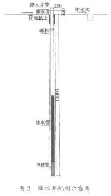 可满足要求。 经过计算,在未采取降水措施的情况下,需将泥浆密度调整至1.57以上才能保持槽壁稳定,而这个密度是不可能的;如在成槽过程中保持地下水位在5 m以下,则在31 m深槽段的泥浆密度调整至1.15以上后槽壁可以保持稳定。 因此,决定在地墙施工时对地墙周边打设深井进行降水,以降低水压力。 该方法实施方便,成本低廉,设备要求简单,且施工不占用工期,可与槽段施工同时进行,降水井区域槽段施工全部完成后,深井即可废弃回填,对于其它工艺的施工不产生影响,减小了地下水对于槽壁的水头压力,减少了成槽过程中产生塌方的可能。3 深井降水技术要求3.1 井点布设 根据场地内地质条件及地墙深度,确定井点布置的间距、深度及降低地下水位的预期值,达到三者之间的最佳平衡。经计算,拟每隔12 m布设一口降水井,其深度为12 m,预期降水深度为5~7 m。3.2 施工顺序 凿除硬地坪→埋设护口管→安装旋喷桩机→钻进成孔→清孔换浆→下井管→填砾料→井口封闭→洗井→安泵试抽→排水3.3 降水井结构 降水井机构见图2降水采用1寸泥浆泵进行抽水。