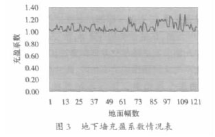 3.4 降水运行注意事项 (1)降水的设备在施工前及时做好调试工作,确保降水设备在降水运行阶段运转正常。 (2)工地现场要备足抽水泵,使用的潜水泵要做好日常保养工作,应该经常检查泵的工作状态。 (3)降水工作应与成槽施工密切配合 (4)降水运行期间,现场实行24 h值班制,值班人员应认真做好各项质量记录,做到准确齐全。 (5)做好井口的保护工作,严禁将井管碰坏以及杂物掉进井内。经常检查排水管、沟是否畅通。 (6)降水施工可能会对周边市级保护建筑产生不良影响。故在降水前应对周边建筑设置沉降观测点,并测定初始稳定高程。在抽水过程中,要不间断的对建筑物沉降进行观测,一旦发现建筑物沉降超过报警值,即应立即停止坑内抽水,采取相应的保护措施,以防止建筑物的继续沉降。4 结果分析 根据实测数据及地下墙统计资料来看,地墙充盈系数平均为1.05(图3),垂直度平均为1/800,满足相关规范及技术要求的规定。周围同类地质条件下建筑的地墙施工,其充盈系数一般为1.25左右,本工程采用深井降水措施后极大的降低了充盈系数的值,也提升了地墙施工的质量,同时取得了良好的经济效益。