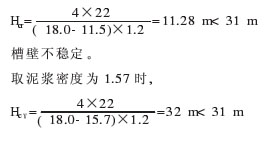 采用三轴搅拌桩进行加固,其本身的施工对于保护建筑也将产生影响,且其施工时间长,完成后还需进行养护,对整个工程的工期产生影响;由于加固范围离槽壁距离比较近,容易造成混凝土浇筑时的超量及绕流等现象,对于后续工艺造成不利影响。其费用较高,增加了施工成本。 对地下连续墙槽壁进行稳定性分析如下: 取正常泥浆密度1.15时,