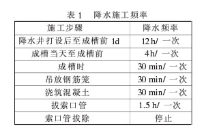 根据实际摸索的经验,总结出降水井措施成败的关键在于降水频率的控制(表1)。降水井的打设在该区域地墙施工前2~3 d进行,期间进行降水,直至索口管拔除。