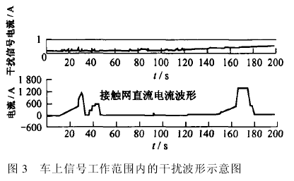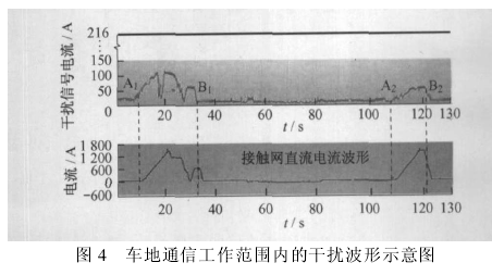 由图4可以看到,在列车向接触网要电的时间段A1→B1和A2→B2,对车地通信信号的干扰波形和接触网直流电流有对应关系,但干扰波形在个别点会有信号畸变。对所有记录的数据进行分析后可知,车地通信信号正常工作范围内的干扰信号幅度最大值为125mA,最小值为0,没有超过限值。5 结语 通过对列车运行的实际监测可以看出,牵引电压、电流随列车运行状态而有明显变化。它们产生的谐波成分,会随机地介入到地铁信号系统的频带内。但分析测得的数据,列车运行过程中产生的电磁干扰值在正常范围内,对信号系统的轨道电路、车上信号、车地通信信号等影响很小。 国内有关车辆对信号系统的电磁干扰研究还是一个新的课题。虽然在测试过程中由于条件所限,没能进行正常运营环境下列车对信号系统的电磁干扰的测试,但测试方法及结果为进一步研究此类问题打下了一定的基础,对今后的设备建设和维护具有参考意义。参考文献[1]徐安.城市轨道交通电力牵引[M].北京:中国铁道出版社,2003:120.[2]秦曾煌.电工学(下册)[M].北京:高等教育出版社,2004.[3]TB/T3073-2003 铁道信号电气设备电磁兼容性试验及其限值[S].[4]同济大学通信信号研究所.地铁信号系统电磁环境研究报告[R].2005.