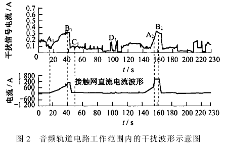 从图1中可以看出,接触网直流电压的最大值约为1800V,最小值约为1500V,则接触网波动约为20%。在列车向接触网要电的时间段A1→B1和A2→B2,接触网直流电压的跌落电压幅度超过200V。在接触网直流电流保持恒定的时间段B1→C1和B2→C2,接触网直流电压也保持了恒定。在列车逐渐停止向接触网要电的时间段C1→D1,接触网直流电压逐渐升高。当列车停止向接触网要电时,接触网直流电压基本保持在1700V左右。在列车制动过程中,车辆最大逆变反馈电压幅度约为150V;在停车期间,逆变引起的电网电压有约50V的波动,这与12相24波头全波整流[2]脉动系数约50V相吻合。2 对轨道电路干扰分析 随列车的运行,测得音频轨道电路工作范围内的干扰波形如图2所示。图中最上面的横线表示音频轨道电路正常工作范围内干扰的限值为600mA[3];A1、B1、C1、A2、B2、C2分别标示了干扰信号变化的特殊点。 从图2中看到,在列车向接触网要电的时间段A1→B1和A2→B2,随着接触网直流电流的增大,音频轨道电路工作范围内干扰信号的幅度也不断增大;在列车停止向接触网要电的时间段C1→A2,干扰信号仍有一定的幅度,这可能是列车上空调机组起、停造成的干扰。对测得的所有数据进行分析可知,音频轨道电路工作范围内,干扰信号幅度的最大值为300mA,最小值为0,没有超过限值。
