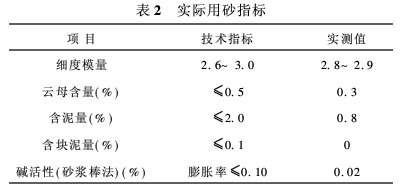 (2)砂 重点控制其主要质量指标(如含泥量、泥块含量、云母含量等)外,粒径上选用细度模量约为3.0的中粗砂,以提高混凝土的施工性能和强度。实际用砂主要检测指标如表2。
