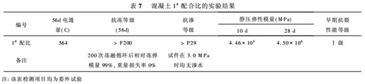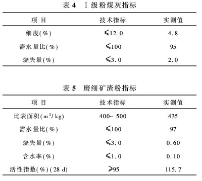 (4)矿物细掺料 混凝土配制时加入矿物细掺料,可降低混凝土内部温升,改善混凝土的工作性能,增进混凝土后期强度,同时还可改善混凝土的内部结构,提高混凝土的抗腐蚀能力。混凝土配制时掺入了粉煤灰和磨细矿粉两种掺和料。实际所用Ⅰ级粉煤灰和磨细矿渣粉的主要检测技术指标如表4、表5。