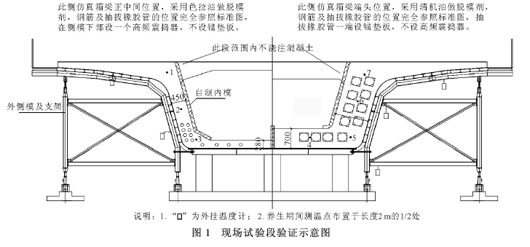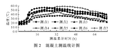 (2)配合比在现场验证 混凝土配合比选定之后,预制箱梁正式生产之前,现场选定一制梁台座,浇筑了截面尺寸与实际预制箱梁一致的2 m“箱梁试验段”,对所配制的混凝土从主要施工性能、温度控制等方面,进行了模拟实验验证(见图1)。 在后期的实际施工中,同样通过不同位置埋设测温片,进行混凝土内部温升测定,和对主要施工性能的测定,所配制的混凝土均满足后期预制箱梁生产所期望达到的要求(图2)。6 结论和建议 (1)采用选定的各项原材料试配的C50高性能混凝土配比,各项技术指标经检验均满足预制箱梁对混凝土施工工艺和耐久性要求。 (2)通过掺入磨细矿渣粉和粉煤灰,较好地控制了混凝土内部温升。 (3)磨细矿渣粉需水量小、比表面积大、活性系数高,掺量提高会使混凝土粘滞性提高,对输送和振捣不利;粉煤灰相对需水量大、比表面积大、活性系数低,掺量提高会使混凝土流动性降低、早期强度降低。配合比设计时必须综合考虑上述因素,并通过试验加以确定水泥、磨细矿渣粉和粉煤灰的最佳组合,才可达到理想效果。 (4)高性能混凝土对各种原材料质量的波动较为敏感。现场施工必须加强原材料的进场检验和生产混凝土时对原材料准确计量等环节的控制,以保证混凝土满足施工要求。参考文献[1]吴中伟,廉慧珍.高性能混凝土[M].北京:中国铁道出版社,1999.9[2]客运专线高性能混凝土暂行技术条件[S].2005.7[3]客运专线预应力混凝土预制梁暂行技术条件[S].2005.5