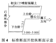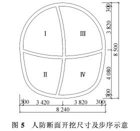 2)水位埋深浅 向下开挖5~8m即可见地下水,区间主体隧道全部位于地下水中,增大了施工难度。2 施工方法2·1 区间隧道主要施工步序 本区间隧道标准断面采用上下台阶法进行施工,上台阶施工时预留核心土,下台阶施工时做放坡处理,坡度≤3∶1。根据现场实际情况,上下台阶长度控制在3~5m为宜,如图4所示。在区间靠近怀远门站一侧,左右线分别设置一道人防,人防段长13.2m,采用CRD工法施工,分4步进行开挖。人防断面开挖尺寸为高8.5m,宽8.24m。为保证由标准断面向人防大断面过渡时的开挖安全,在变断面处设置1m的渐变段,坡度为45°,逐渐进入人防断面。人防断面施工步序如图5所示。