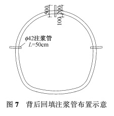 由于本标段地质基本全部为中粗砂层,土层稳定性不好,在渗漏水较大地段对超前小导管采取加强处理措施,L=1.8m,每榀格栅打设一环。 小导管打设方法:根据砂层地质的特性,小导管采用引孔打入法。首先使用Φ20mm高压风管进行吹孔,然后将小导管直接插入,导管外露端用棉纱封堵,防止喷射混凝土时堵塞管口。外露长度控制在10cm左右,以便于安装管路。 注浆安排在喷射混凝土完成以后进行,目的是防止浆液从开挖轮廓面溢出,影响注浆效果及浪费材料。注浆材料采用沈阳市生产的THE-Ⅱ型固砂剂,其特点是操作简单,凝结速度快,节约循环时间。配合比为:固砂剂∶水=(1∶3)~(1∶4),注浆压力在0.3~0.6MPa,注浆完成后立即用棉纱封堵管口,尽量防止浆液外溢。2·2·3 初支背后回填注浆 由于混凝土的自重及喷射混凝土密实度等的影响,初支背后与土体之间不可避免的会出现空隙。为了有效减小由于空隙引起的地面沉降,在施工时预先埋设Φ42mm注浆钢管,钢管长50cm左右,埋入砂层20cm,外露10cm,梅花形布置在拱顶及两侧拱脚位置,每3~5m设置1道。如图7所示。 待仰拱成环10m左右后,便开始进行背后回填注浆。注浆液采用水泥-水玻璃双液浆,注浆压力控制在0.2~0.4MPa,采用间歇注浆的方式进行,注浆与静压交替进行,保证回填密实。2·2·4 重要地段的施工方法 经过现场调查分析,在右线DK15+800~DK16+070里程段,由于管线渗漏严重,被确定为特殊处理地段。具体措施如下: 1)砂含水率监测 在砂层中,砂的含水率为表征地表安全性的重要参数。在施工过程中每天对砂含水率监测2次,使用超前探管取出掌子面前方2~3m的原状砂,使用酒精进行烘烤。根据日常实验,测定砂的正常含水率为6%~9%,超出此范围需给予高度重视,及时采取加强措施,同时加强拱顶及地表的沉降监测。 2)超前支护 超前小导管由原来的2榀一打改为每榀一打,长度为1.8m/根,环向间距加密,调整为20cm/根,注浆液采用固砂剂,配合比为(1∶3)~(1∶4)。必要时对上台阶掌子面进行全断面注浆,此时采用L=3.0m的长导管,每施工1.5m施做一次全断面注浆,保证注浆体的搭接。