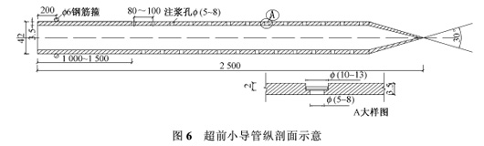 由于砂层地质稳定性不好,很容易产生坍塌,除盾构法采用机械施工外,暗挖施工基本全部采用人工进行开挖,并及时喷射混凝土封闭成环,每施工0.5m为一个循环。主要工序为:上台阶开挖→格栅安装→连接筋焊接→打设超前小导管→喷射混凝土→小导管注浆→下台阶开挖→下一循环,每循环施工时间约为5~6h。 由于有轨运输受限制较多,速度较慢,本区间采用无轨运输方式,每个掌子面配备2~3台翻斗车,统一运至竖井提升斗处,再由龙门架提升至地面临时存土场。2·2 砂层地质中初支施工方法2·2·1 超前大管棚 大管棚通常设置在断面变化处及危险性较大的地段。本区间在竖井进横通道马头门处、横通道进区间正线马头门处设置大管棚。大管棚采用Φ108mm、δ=5mm的热轧无缝钢管,横通道马头门处管棚长9m,区间正线马头门处管棚长12m。管身上钻6~8mm的眼孔,梅花形布置,孔距30cm,以保证管棚注浆时浆液的扩散。管棚分节制作,受作业空间的限制,采用3m一节进行施工,施工过程中逐节夯进、接管。接头采用坡口焊连接牢固。管棚沿拱部开挖轮廓线外边缘120°范围布设,环向间距30cm,外插角2°~2.5°。注浆液采用水泥砂浆,浆液配比为1∶1∶1,注浆压力为0.2~0.3MPa。 大管棚在粘土层施工时一般采用夯管锤顶入法,但若在砂层中夯进,容易造成砂层的扰动,在开挖时产生坍塌。本区间采用吹管顶入法,高压风管插入管棚内,将砂子吹出,然后使用冲击钻顶入,顶进30~50cm左右,重复进行吹管,依次循环完成大管棚的打设。2·2·2 超前小导管 小导管采用Φ42mm热轧钢管,δ=3.5mm,一端做成尖状。小导管长L=2.5m,每2榀格栅打设1环。布置在拱部120°范围,环向间距30cm。在管身上钻?(5~8)mm的孔,孔间距8~10cm,梅花形布置,末端1~1.5m不打孔,以防止注浆时浆液外溢。小导管如图6所示。