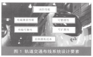 轨道交通综合布线系统的设计1 轨道交通与综合布线系统 地铁、轻轨都是城市内部的轨道交通系统,是城市公交体系的一部分。与以往的公共交通工具相比,它具有运量大、速度快、污染小、能耗低、建设快、成本低等特点。大力发展城市轨道交通,对于缓解城市交通拥挤和改善城市大气环境具有十分重要的意义。 城市轨道交通系统一般由供电系统、环境控制系统、控制与运行系统、自动售检票系统、自动扶梯/电梯系统、通信系统、信号系统、消防报警系统、给排水系统等组成。在这些子系统的内部和子系统之间,不但存在着大量的信息交换,而且,这些信息的表现形式不仅有开关量,还有对干扰十分敏感的模拟量,因此,布线系统十分复杂。 随着数字技术的发展,轨道交通系统的数字化程度不断地提高,这也对布线系统提出了新的要求。综合布线系统本身所具有的兼容性、开放性、灵活性、可靠性、先进性和经济性等优点,使其在轨道交通系统中的应用越来越普遍。2 轨道交通布线系统的特殊性 轨道交通的特殊性,决定了轨道交通布线系统的特殊性。如图1所示,轨道交通布线系统不仅要考虑系统的拓扑结构、传输性能,还要更多地考虑消防、管理、系统升级等方面的要求。