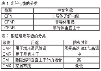 3.3 线缆选型 综合布线系统中的电缆承担着固定通信系统中所有信息流的传输任务。由于弱电信号功率较低,即便是老化,也不会因短路引起自燃而造成火灾。因此,布线系统的消防安全性能主要体现在两个方面:一方面是在火灾发生后,火势不能沿着电缆线路到处蔓延;另一方面是有毒气体的释放必需满足最小浓度要求。我们在设计轨道交通的结构化布线系统时,必须减少通信电缆的安全隐患,提高布线系统的安全性。 防火电线电缆是具有防火性能电线电缆的总称,通常分为阻燃电线电缆和耐火电线电缆两种。 各个国家和城市都有不同的防火法规,在国际上,美国的UL实验室和国家电气规程(NEC)是目前最为广泛接受的电气安全要求,它们对铜缆和光纤都有严格的阻燃要求。Molex企业布线网络部的产品,采用了它们的电缆防火等级体系及阻燃分类。 NEC条款770针对光纤电缆的分类如表1所示,其中OFNP具有最高的阻燃等级。
