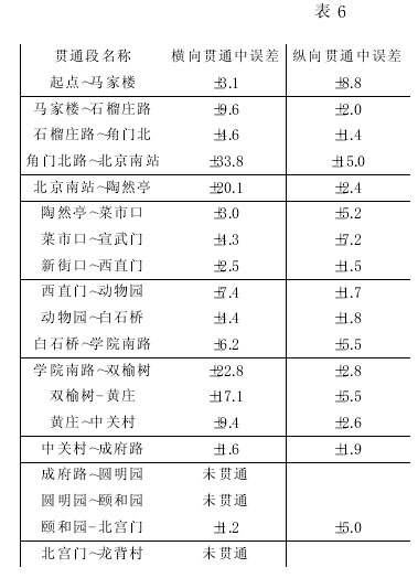 横向贯通中误差平均值为±15.9 mm, 纵向贯通中误差平均值±12.7 mm。3.3 北京地铁 10 号线, 各贯通段贯通测量误差精度统计见下表: 北京地铁十号线正线全长 24.6 公里, 起于万柳站止于劲松站, 全部是地下线, 工期自 2003 年12 月 27 日至 2007 年 12 月 31 日。联系测量方法主要为“:全站仪 + 铅锤仪 + 陀螺经纬仪 (20″)”和“全站仪 + 悬挂钢丝 + 陀螺经纬仪(5″)”等方法, 贯通情况统计如下: