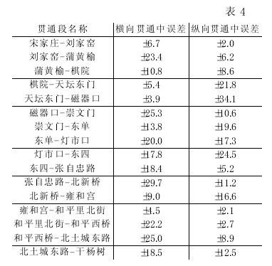 横向贯通中误差平均值为±16.3 mm, 纵向贯通中误差平均值±9.1 mm。3.4 北京地铁 4 号线贯通测量误差统计 北京地铁 4 号线, 马家楼至龙背村, 正线全长 28.39km。联系测量方法主要为“全站仪 + 铅锤仪 + 陀螺经纬仪(5″)”“、投点定向法”等方法。全线贯通情况统计如下: