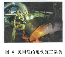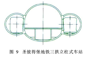 (3)借鉴国外盾构综合法修建地铁车站。国外已经采用了配合盾构法修建地铁车站的施工方法,这种施工方法可一次采用盾构法将区间隧道和过站隧道贯通,然后在盾构隧道的基础上扩挖而形成地铁车站(见图9)。这种方法的优点是能充分利用TBM设备,进一步提高地铁工程的建设质量、缩短建设周期、从总体上较大幅度地降低工程造价,从而使得TBM在城市地铁工程中得到了大规模的采用。国内广州地铁3号线林和西路站在设计上曾作了尝试性的研究。