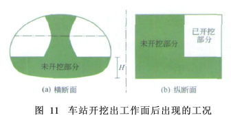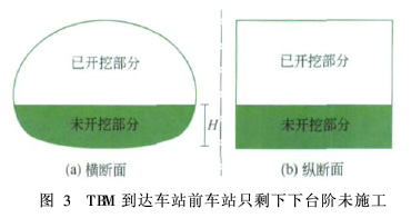 由于这种情况TBM和隧道施工不存在交叉作业,各自施工不受相互影响,故盾构施工大多采用这种过站方式。因此,建议重庆如果采用TBM施工,车站尽量提前开工,多采用步进或牵引过站方式,最大限度地发挥TBM的优势。2.1.2 TBM到达车站前车站只剩下台阶未施工如果在TBM到达车站前,车站不能开挖完成,则施工时先开挖上、中台阶,然后进行初期支护,保留下台阶(下台阶高度H由TBM高度确定)土体,待TBM通过后再开挖(见图3)。下台阶施工可让TBM依靠水平支撑反力进行掘进施工,待TBM通过车站,再开挖中间部分土体。美国纽约地铁就是采用这种方法施工(见图4)。