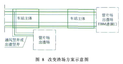 (1) 利用暗挖车站区间隧道联络线或开挖联络通道,变双通道单线出碴为单通道双线出碴,具体方案见图6~图7。 由于围岩条件较好,车站范围内可不安设管片,只根据围岩条件采用锚、喷、网联合支护。待TBM完全通过后,利用一侧导洞作为TBM运输通道,采用半断面分部开挖法,分部开挖车站一侧断面,并及时施作初期支护,待一侧导洞扩挖完成后,再将运输轨道改到另一侧,扩挖对侧的导洞,两侧交替进行开挖及支护,并及时施作二次衬砌。两种方法在车站内均设置岔线,当一侧的TBM通道扩挖时,碴车通过岔线转入另一TBM通道,从而连续出碴。如果联络通道可以设置在车站,则后期车站施工对联络通道有一定的干扰,亦可将联络通道设置在区间隧道,利用线路本身的联络通道或人行通道进行转换。 采用该方法施工,在其中一条TBM出碴通道废弃进行车站施工的时候,可以利用该条通道作为车站的出碴通道。同时,由于该通道不受TBM出碴影响,也可以对该通道进行二次衬砌施工。 (2)TBM首先掘进通过车站,再利用车站主体的竖井或增设竖井,作为TBM的出碴、管片运输、通风通道。TBM遇到与车站同时施工的情况,最有可能出现在前3个车站,这种方法可以在TBM施工完前3个车站后,将第3个车站的通风竖井用于出碴或增加出碴竖井,将TBM的管片场和出碴场改到第3个车站,前3个车站可利用TBM开挖的区间隧道出碴(见图8)。