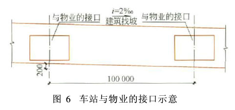 如图6所示,无论是上盖物业还是平接物业,其斜板都将给设计、施工、运营管理带来非常大的困难。2.5 给垂直换乘站的接口造成困难 很多地铁建筑师在做换乘站的设计时,就抱怨对不同方向的板采用2‰的坡度,造成标高差错碰漏,施工上的难度就更大了,也给运营安全留下了隐患。3 设置平坡后的排水思路 (1)为了设备安全,车站内的清洁不允许冲洗作业,而是使用拖把进行少水快干的清洁方法,因此不存在经常性的冲洗排水。 (2)消防用水几十年不遇,一旦发生火灾使用消防用水后可利用平坡漫流辅以人工排水。 (3)水沟内的挡水槛与车站主体建筑一次浇筑完成,并做防水砂浆及防水涂料处理,允许水沟内积水,当水沟内水量较少时,水沟内的水自然蒸发;当水沟内由于外界原因产生较多水时,水可以漫流进地漏或积水井 (4)地下站车站轨行区道床由线路中心线向两侧水沟找坡,道床上如果有水会流向两侧水沟内,水沟纵向平坡,水漫流向积水井。 高架站车站轨行区道床无水沟,但高架站可以根据车站条件做多处排水管,由车站建筑找坡,组织排水流入排水管内。4结语 地铁车站各层板仅仅为排水设置2‰的坡度,造成设计、施工、装修、设备安装及物业衔接等诸多困难,得不偿失。排水观念解决后,车站各层板及纵向水沟完全可以设计为平坡。参考文献[1]深圳地铁三号线初步设计[R].中铁二院,2006.[2] GB 50157—2003地铁设计规范[S].北京:中国计划出版社,2003.