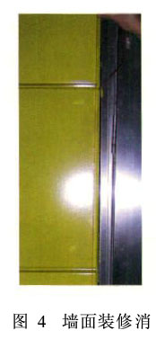 第2种方法为:墙面垂直(铅垂)安装,墙面上的设备箱门及防火门也垂直安装,这样的处理墙面板间要有高差,且门周边间隙大小不一,效果不好,但对门的使用没有影响,如图5所示。