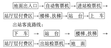 3 地铁车站的布局形式及结构类型 (1)地铁车站的设计从建筑布局的形式可分为浅埋式和深埋式,浅埋式车站由于车站的埋置深度浅,带来一系列的经济效益,如土方减少、技术难度减小、出入口通道客流上下高度减小等等,大大节省车站在地下的建设投资。这种车站的前提是,地面下没有各种城市管线通过,也不在城市主要道路下,并得到地下铁道线路走向的允许;深埋式车站因受周边环境的影响和线路走向的制约,必须较深地建于地下,随之而来的是深基坑等各项技术难度加大、土方增加、投资较大和客流上下高度的增加。 (2)地铁车站设计从结构的类型可分矩形箱式地下建筑和圆形或椭圆形的隧道式建筑,矩形箱式车站,基本上都是采用地下连续墙后大开挖的现浇钢筋混凝土结构,施工时对周边的环境影响较大,土方量也大,对地面交通影响也大;而圆形或椭圆形的隧道或暗挖车站建筑,基本可采用盾构掘进的方式,土方量减少,同时对周边环境的影响也大大减少,但带来的技术要求则较高且需更大的盾构掘进等机械和设备。地铁车站一般宜设在线路直线段上,车站的型式选择应根据线路条件和所处环境特点,因地制宜地进行比选确定,结合建筑造型、结构类型和施工方法,合理地利用城市建筑空间,做到与周围建筑结合好,拆迁少,对地面交通干扰小,对地下管线影响小、改移方便,换乘车站需对换乘形式、使用功能以及综合经济指标等多方面进行比较,换乘节点应根据远期线网的情况分别采用同步实施或是预留接口的实施条件。 地铁车站设计涉及专业有:客流预测,线路,限界,行车,建筑,结构,通风,动照,给排水,气体消防,FAS、BAS,通信,信号,供电,接触网,杂散电流,安全门,人防,电扶梯,AFC等。所以在实际设计中根据地下建筑的特点,各专业一定要相互紧密配合和协调,尽可能的避免将来变更设计等事情的发生。 地铁车站是人流相对集中的交通建筑,所以在设计中必须有序地组织人流进站和出站,并方便地铁换乘,满足客流高峰时所需的各种面积规定及楼梯、通道等的宽度要求,上下楼梯位置的设置能均匀地接纳客流,另外要有足够的设备用房和管理用房,以满足技术设备的布置及运行管理的要求,使车站具有与之要求的完善的使用功能。 进站客流路线: