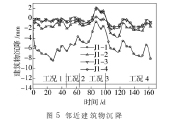 2.4 邻近建筑物沉降 邻近建筑物各测点沉降时程曲线如图 5 所示。沉箱施工过程中, 最靠近施工位置的 J1- 1 的相对沉降值最大, 其最大沉降达 - 8.36 mm, 发生在工况 1, 该测点在工况 4 下沉降值也较大, 达 - 8.03 mm。其余各测点的沉降值均较小, 一般在±2 mm之间, 说明沉箱施工对这些测点沉降的影响较小。