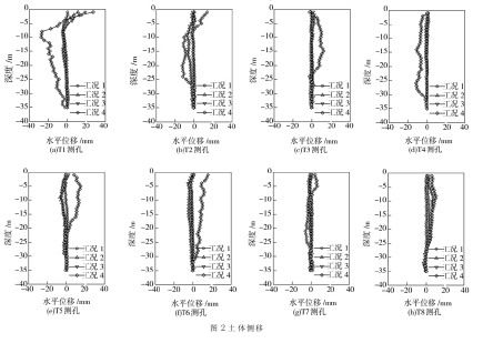 2 监测结果分析2.1 土体侧移 在沉箱周围共布置 8 个土体侧移测孔, 北侧 3 孔(T5、T6和 T7), 西侧 4 孔(T1~T4), 东南侧 1 孔(T8)。8 个测孔在不同工况下的变形曲线如图 2 所示。