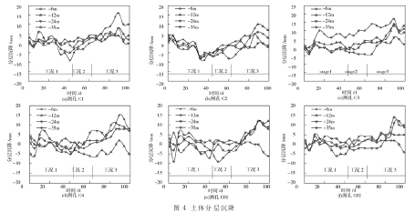 总体而言, 开始 3 个工况下所有测孔土体的侧移均较小, 量值一般在±5 mm以内; 各测孔均在工况 4 下侧向位移最大。所有 8 个测孔中, T1 测孔土体的水平位移最大, 工况 4下的位移达到 - 27.24 mm。从图中可以看出, 测孔距沉箱越远, 土体侧移相对越小。2.2 地表沉降 不同施工工况下各断面地表沉降如图 3 所示。从 4 个断面的地表沉降曲线可以看出, 各个断面的最大地表沉降点均在最靠近沉箱的测点, 随着距沉箱边距离的增加, 各测点的地表沉降逐渐减小。最大沉降点位于 4 号断面的 D4- 2 测点, 其最大沉降达 - 28 mm。2.3 土体分层沉降 在沉箱两侧共布置 6 个土体分层沉降测孔, 各测孔土体分层沉降如图 4 所示。不同深度处各测孔的沉降规律基本一致, 沉降量同时增加或减小。图 3 和图 4 监测结果均表明沉箱施工周围土体沉降的影响很小。