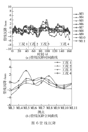 2.5 管线沉降 邻近管线各测点在沉箱施工期间的沉降曲线如图 6 所示。就沉降曲线的整体形状而言, 沉箱施工对各管线变形的影响并不大, 且各管线测点的垂直变形并无明显的变化规律。管线各测点中最大沉降点为 M3 测点, 其最大沉降为- 5.4 mm, 发生在工况 4; 各测点中最大上抬位置在 M5 测点,其最大上抬位移为 4.0 mm, 发生在工况 3。