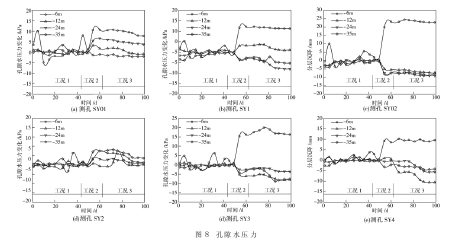2.7 孔隙水压力 沉箱周围测点孔隙水压力变化如图 8 所示。距地表越近, 孔压的变化量越大。距沉箱最近的两个测点 SY01 测孔最大孔压变化量为 10.67 kPa, 深度 - 6 m; SY02 测孔最大孔压变化量为 24.38 kPa, 深度 - 6 m。整体而言, 从工况 2 开始孔隙水压力的变化值较大, 与地下水位的变化原因一致。