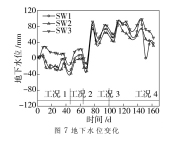 2.6 地下水位 沉箱周围水位测点水位的相对变化如图 7 所示。工况 1和工况 2, 沉箱下沉深度较浅, 沉箱底部施工施加的气压也较小, 气压平衡作用效应不明显, 因此地下水位变化幅度不大, 其中 SW2 测点的最大水位下降幅度仅为 - 37.8 mm; 随着箱体的第三次下沉, 所有测点的水位迅速上升, 且各测点水位的上升幅度相近, 工况 3 下最高水位点为 SW3 测点, 其水位相对于初始水位上升了 91.7 mm; 箱体第四次下沉后期,各测点水位相对于工况 3 有稍许的下降, 但水位仍高于初始水位。