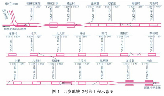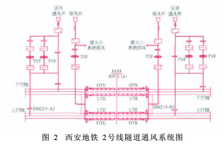 西安地铁2号线隧道通风系统设计摘 要 通过使用美国交通部SES软件,对西安地铁2号线隧道通风的优化方案设计进行建模计算。以地铁运行远期条件作为计算依据,对隧道内的温度、换气量进行统计分析,得出其隧道内温度在38℃以内、换气次数在7次/h以上能满足设计要求的结论,并对隧道内的压力进行计算,为其他设计提供数据参考。关键词 隧道通风 SES软件 区间换气量 逐时计算 屏蔽门1 工程概况 西安市城市快速轨道交通2号线一期工程北起铁路北客站,线路沿西安市南北向主客流走廊布设,经铁路北客站、市政中心、经济开发区、北大街、钟楼、小寨商业文化中心、高新开发区、西安国际展览中心至长延堡,线路长约20.3 km。设铁路北客站、麻家什字、城运村等17座车站,有5座车站分别与其他轨道交通线换乘(见图1)。