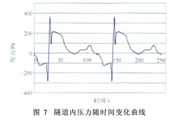 可以看出,右线区间风量基本维持在80~100m3/s之间,通风换气量能满足要求;左线在下行线第一个站(长延堡)区间风量较小(45.9m3/s),但换气也在6次/h以上,其余均在70~90m3/s之间,满足区间的换气量要求。 对隧道内压力进行分析,将列车设置为全速过站(55 km/h),直接对屏蔽门的压力进行计算,选取两个行车周期(4min),得到图7屏蔽门压力曲线。最大压差点出现在列车车头恰好经过屏蔽门数据读取点,最大压差值为652.6Pa,即屏蔽门承压大于这个值即可,其他设备(包括电缆、检修平台等)均需要考虑此压力的影响。