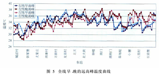3 计算结果及比较 根据西安地铁2号线初步设计的资料,下面对正常运行模式进行了计算,并专门针对活塞风道、区间、车站的温度和风量的影响进行了分析。GB 50157—2003《地铁设计规范》规定温度设计标准为正常运行时,隧道的最热月日最高平均温度小于等于40.0℃,区间换气量不少于3次/h(见图5)。对温度曲线进行了分析,得出如下结论: