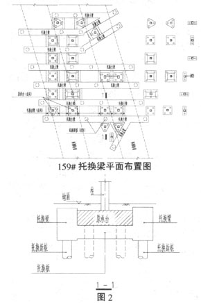 1.3建筑物平面布置2托换方案设计2.1建筑物桩基托换重点设计思路原则2.1.1建筑物保护原则 朝桂区间桩基托换的重点在于隧道施工期间必须保证沿线的地面建筑物的正常使用。 本区间隧道地处桂城繁华闹市区地带,地面道路纵横交错、车如流水人如织,道路两侧楼宇林立、商铺星罗棋布,加上隧道结构埋置又较浅,因此,要尽量在平面位置上避开建筑物基础。在线路一次次的修改优化后,还是这5栋建筑物的桩基础受到盾构掘进的影响,需重点保证盾构通过的建筑安全。 (1)根据沿线建筑物的现状、基础型式、房屋结构类型、房屋层高和地质状况、与隧道位置关系、既有桩基承载力和地层变形沉降进行分析和计算,确定建筑物保护方案; (2)对桩基侵入隧道结构轮廓外1m范围内的建筑物进行桩基托换; (3)以安全为前提,对桩底与隧道顶距离小于3m的建筑物采取注浆加固或筏板托换的保护措施; (4)对其它沿线建筑物加强监测,必要时在地面进行跟踪注浆。2.1.2桩基托换方案比选 下面就南海第二建筑设计室办公楼(159#)为例作阐述。159#现有4层框架结构,基础的桩长18m,桩端已经穿过隧道,上部原有设计基础考虑支承7层建筑,后来上部建成4层,故上部荷载相对不算太大。初步定下以下两个方案: 方案一筏板托换:施工相对简单可考虑结合原有桩基共同受力。但筏板与原有桩之间受力不明确,特别是筏板与原有桩基础的受力上分配上无法确定。筏板下的土体须采用旋喷桩进行加固处理,加固过程中很对原有桩损害较大。 方案二桩梁托换:平面布置显得纵横密布,难以满足规范要求的摩擦桩3倍中心距要求。新桩承载可以不受既有桩基的影响,但是钻新桩时的振动会对薄弱的旧桩有扰动,加大上部结构倾斜趋势,对结构有所不利。但托换受力明确。桩基托换常采用侧向托换梁支承承台型式,托换梁梁高在1.5~2m范围内,比原有建筑物承台要高,又考虑建筑管线分布,梁底已经超过承台底的深度了。在这空间高度内可以布置托换板传递上部荷载,荷载自上至下清晰明了。对照广州三、四号线的房屋托换,常有承台侧边植筋类型,此处照搬,可以替代下方的托换载体,效果也不成问题,只是植筋工序更多,还会白白浪费下方的开挖空间,更可能直接破坏既有承台。 经过多轮的专家评审,根据建筑物与隧道关系,桩梁结构布置,及经济比较,专家推荐采用桩梁托换。承台下方由板传力,板根据荷载与跨度相应配筋,四边由主梁和次梁支承。原来设计布置时次梁底与板底平齐,梁顶与承台第二道台阶面平齐,来增加托换结构的整体稳定性。不采用植筋连接。