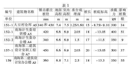 1.1周边建筑物分布情况 编号151-1#栋大豆村仓库位于佛山涌西侧,5层框架结构,其中东向的二层直接佛山涌河堤,河堤高程在10m左右;堤下地势较为平坦,高程约为7.4m。159#现状为4层框架结构,不过其资料显示桩基按7层结构设计。而152-1#和152-2#属南海计生委,另外157-1#为南海第二建筑设计室宿舍。周边有密集的民房和商业区,地势较为平坦。