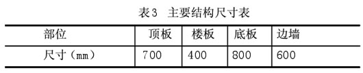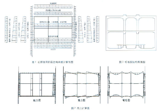 结构计算简图如图1所示。在该模型中,土的弹性抗力可以用受压弹簧模拟,计算时可以用叠代法实现。 计算结果:经过有限元数值分析,标准段结构内力计算图如图2所示。由于考虑围护桩的作用,车站主体随着使用时间的增加,围护桩的刚度会不断削弱,主体结构各层板的跨中弯矩会随之增加,因此在结构配筋时,跨中受力钢筋的设计应应引起充分注意。 标准段设计方案:根据各种工况下的结构计算分析,得出地震阶段对结构设计不起控制作用,依据正常使用阶段和人防阶段的内力结果拟定本站主要结构断面尺寸如表3所示,标准段结构断面图如图3。结论