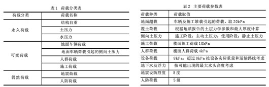 2.水文地质 车站水位埋深较深,地下水位远低于车站结构底板。车站采用明挖法施工,施工期间可不考虑降水,但应考虑地下水的动态变化及上层滞水的影响。施工中对于局部的上层滞水和雨水等,可在基坑内设置排水沟和集水坑,采用明排的方式处理。 车站地下水潜水对混凝土结构无腐蚀性;在干湿交替环境下对钢筋混凝土结构具有弱腐蚀性,在长期浸水的环境下对钢筋混凝土中的钢筋无腐蚀性,对钢结构具有弱腐蚀性。计算荷载 车站结构设计主要考虑以下几种荷载,如表1所示。计算简图与结果 计算模型沿车站纵向取单位长度按平面杆系有限元法进行计算。结构构件根据承载能力极限状态及正常使用极限状态的要求,分别进行承载能力的计算及稳定、变形、裂缝宽度验算。结构计算中应考虑钻孔桩对主体结构受力的影响。 正常使用阶段结构内力分析考虑施工阶段和长期使用两种工况,施工阶段不考虑地下水的影响,长期使用工况按抗浮设防水位计算,取两者包络值进行结构设计。