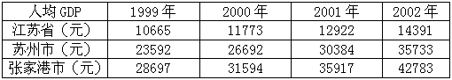4.1999~2002年江苏省、苏州市、张家港市人均GDP,见表4: