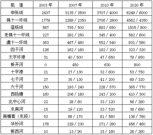 3.由相关观测资料和统计资料分析得到2003年张家港市各航道的通过量,见表6。