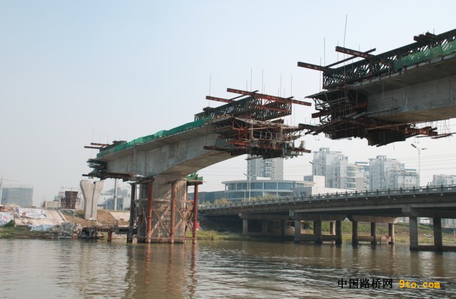 悬臂浇筑法又称挂篮法。在墩柱两侧常采用托架支撑,浇筑一定长度的梁段,称为起步长度。以此节段为起点,通过挂篮的前移,对称平衡地向两侧逐段灌筑混凝土,并施加预应力,如此循环作业,每浇筑完一段(3~8m),待混凝土达到设计强度后张拉纵向预应力钢绞线,然后向前移动挂篮,进行下一段施工。