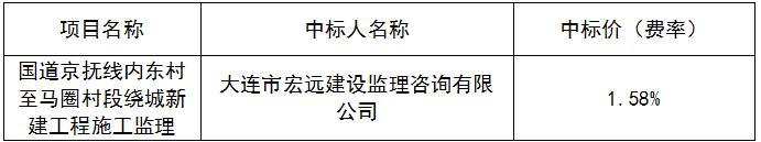 国道京抚线内东村至马圈村段绕城新建工程施工监理中标结果公告