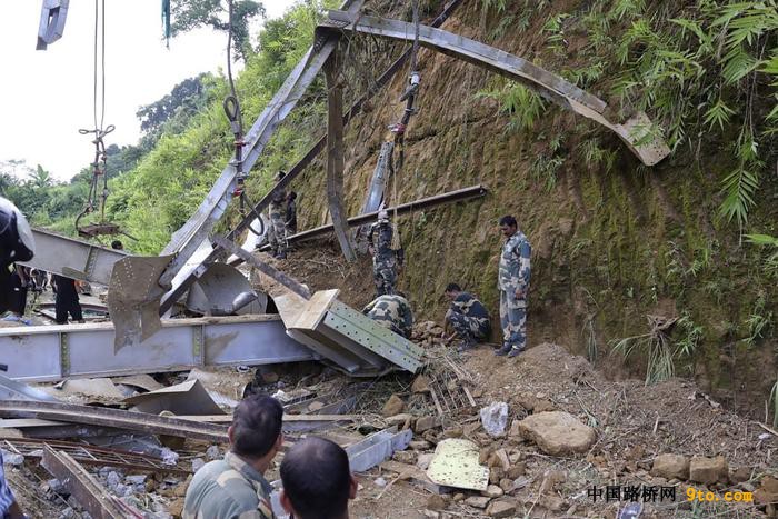 当地时间2023年8月23日,印度米佐拉姆邦塞朗地区,一座正在施工的铁路桥倒塌,救援人员在事故现场进行搜索。